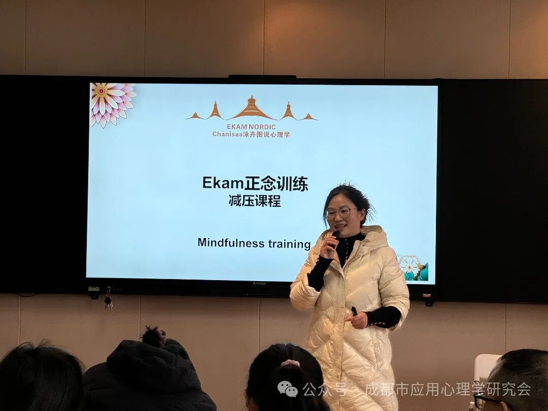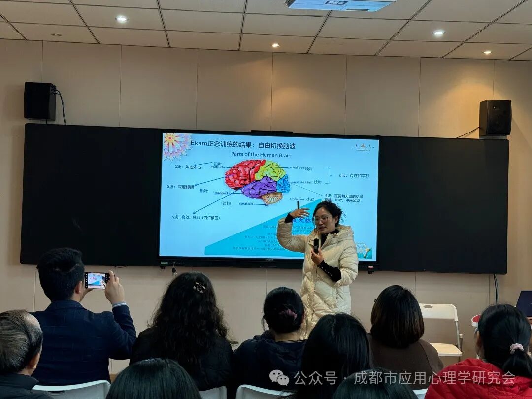 活动开始,谢老师以通俗易懂的方式向教师们讲解了压力管理的理论基础,包括正念训练如何通过调整脑波、激发大脑不同区域的功能来缓解压力。主讲内容图文并茂,结合科学知识,帮助老师们深入理解正念与心理健康之间的联系。比如,讲座中重点提到如何通过训练强化专注和平静的脑波,从而提高应对复杂情境的能力。