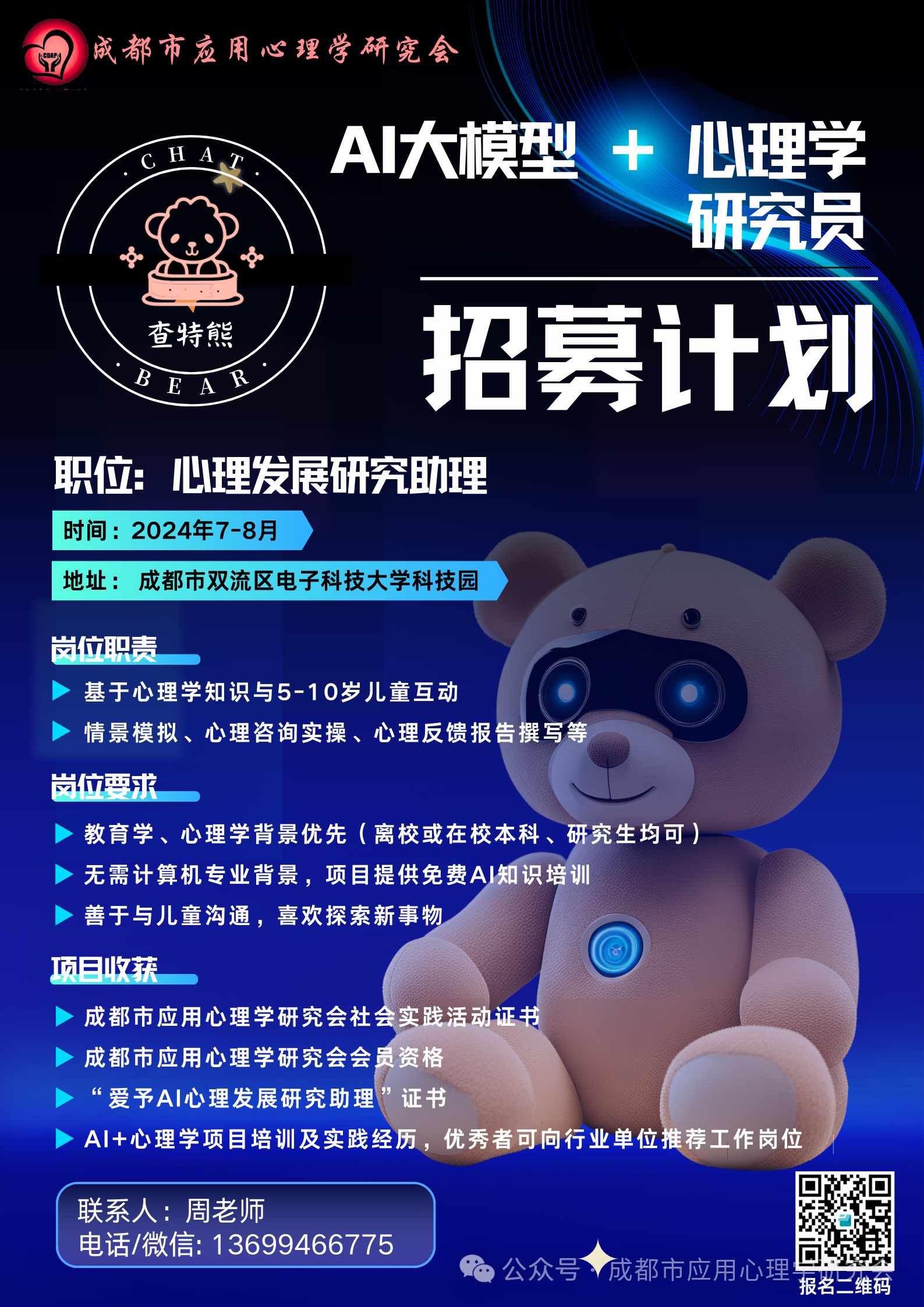 成都市应用心理学研究会联合上海张江数学研究院共同研发智能AI心理陪伴机器人Chatbear(查特熊),现面向大学生及社会从业人员招募实习生或者志愿者,提供给大家AI+心理的研究履历及社会实践证书等。有兴趣的同学或者行业朋友可联系参与,后期可作为Chatbear的友好大使共同发展该项目,获得相应回报。