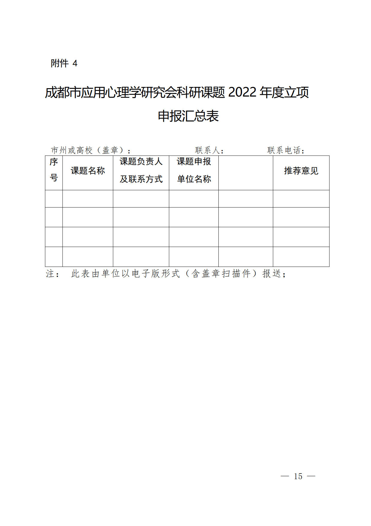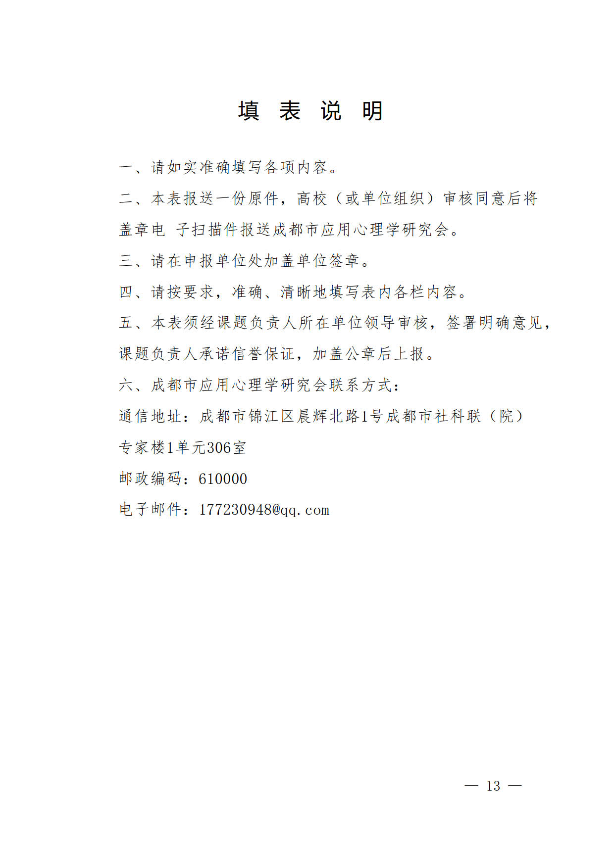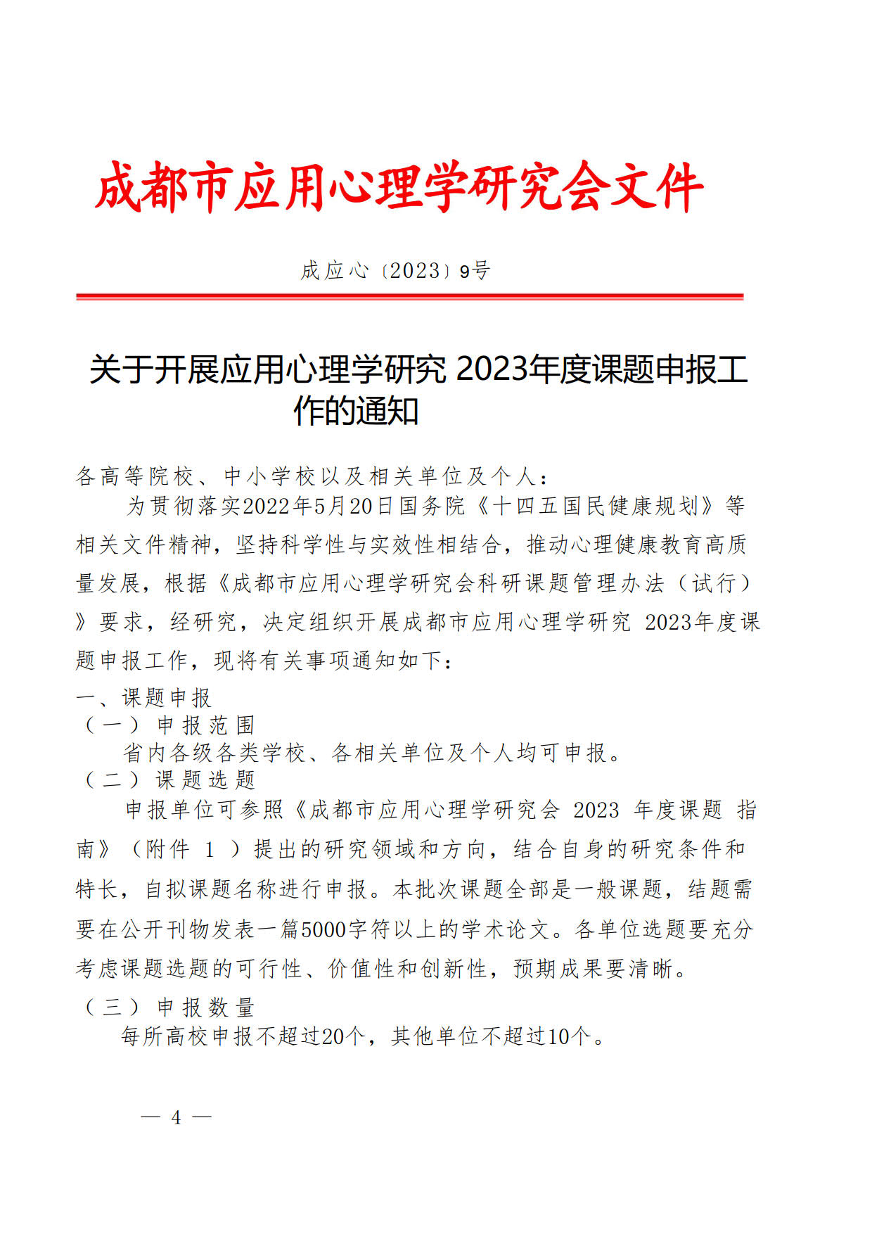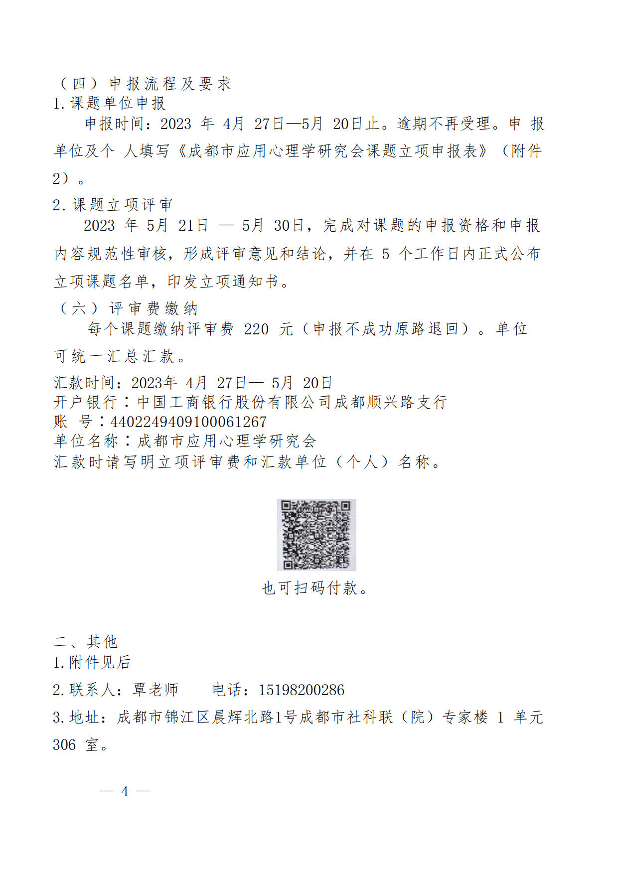 各高等院校、中小学校以及相关单位及个人: 为贯彻落实2022年5月20日国务院《十四五国民健康规划》等相关文件精神,坚持科学性与实效性相结合,推动心理健康教育高质量发展,根据《成都市应用心理学研究会科研课题管理办法(试行)》要求,经研究,决定组织开展成都市应用心理学研究 2023年度课题申报工作,现将有关事项通知如下: 一、课题申报 (一)申报范围 省内各级各类学校、各相关单位及个人均可申报。 (二)课题选题 申报单位可参照《成都市应用心理学研究会 2023 年度课题 指南》(附件 1 )提出的研究领域和方向,结合自身的研究条件和特长,自拟课题名称进行申报。本批次课题全部是一般课题,结题需要在公开刊物发表一篇5000字符以上的学术论文。各单位选题要充分考虑课题选题的可行性、价值性和创新性,预期成果要清晰。 (三)申报数量 每所高校申报不超过20个,其他单位不超过10个。 (四)申报流程及要求 1.课题单位申报 申报时间:2023 年 4月 27日—5月 20日止。逾期不再受理。申 报单位及个 人填写《成都市应用心理学研究会课题立项申报表》(附件 2)。 2.课题立项评审 2023 年 5月 21日 — 5月 30日,完成对课题的申报资格和申报内容规范性审核,形成评审意见和结论,并在 5 个工作日内正式公布立项课题名单,印发立项通知书。 (六)评审费缴纳 每个课题缴纳评审费 220 元(申报不成功原路退回)。单位可统一汇总汇款。 汇款时间:2023年 4月 27日— 5月 20日 开户银行∶中国工商银行股份有限公司成都顺兴路支行 账 号∶4402249409100061267 单位名称∶成都市应用心理学研究会 汇款时请写明立项评审费和汇款单位(个人)名称。 也可扫码付款。 二、其他 1.附件见后 2.联系人:覃老师 电话:15198200286 3.地址:成都市锦江区晨辉北路1号成都市社科联(院)专家楼 1 单元 306 室。 附件: 1.成都市应用心理学研究会 2023 年度课题指南 2.成都市应用心理学研究会研究课题立项申报表 3.成都市应用心理学研究会研究课题立项评审标准 4.成都市应用心理学研究课题 2023 年度立项申报汇总表 成都市应用心理学研究会 2023年4月25 日
