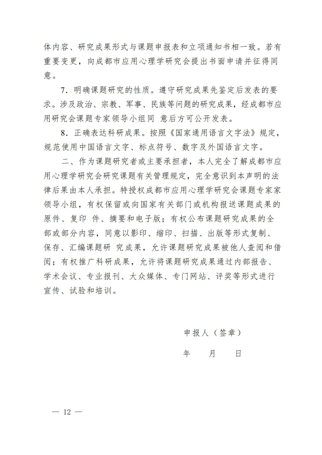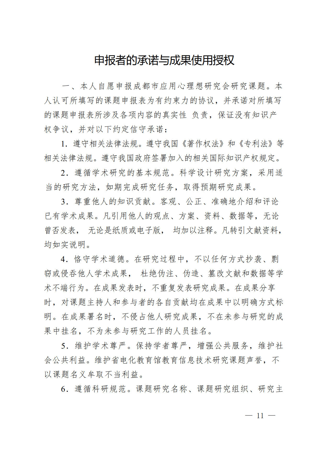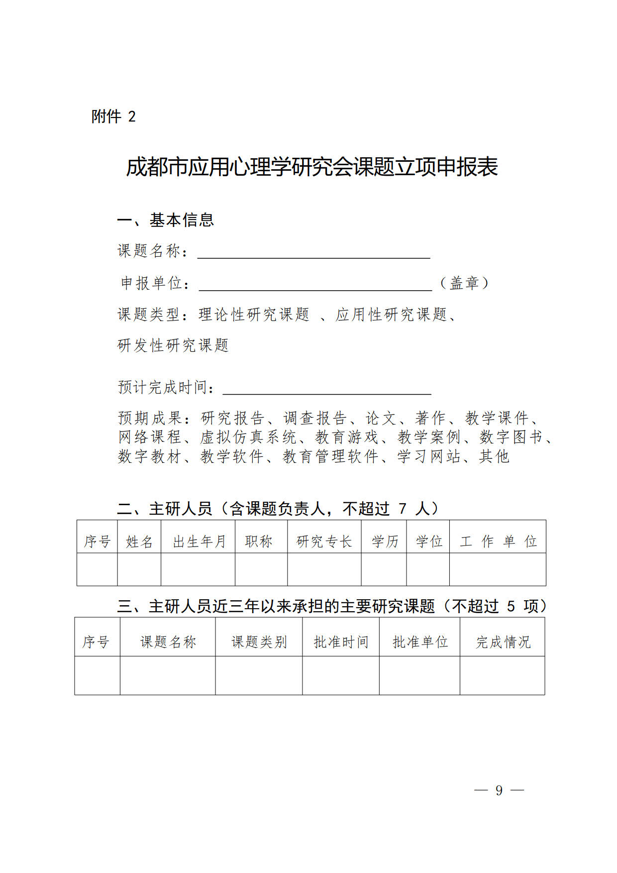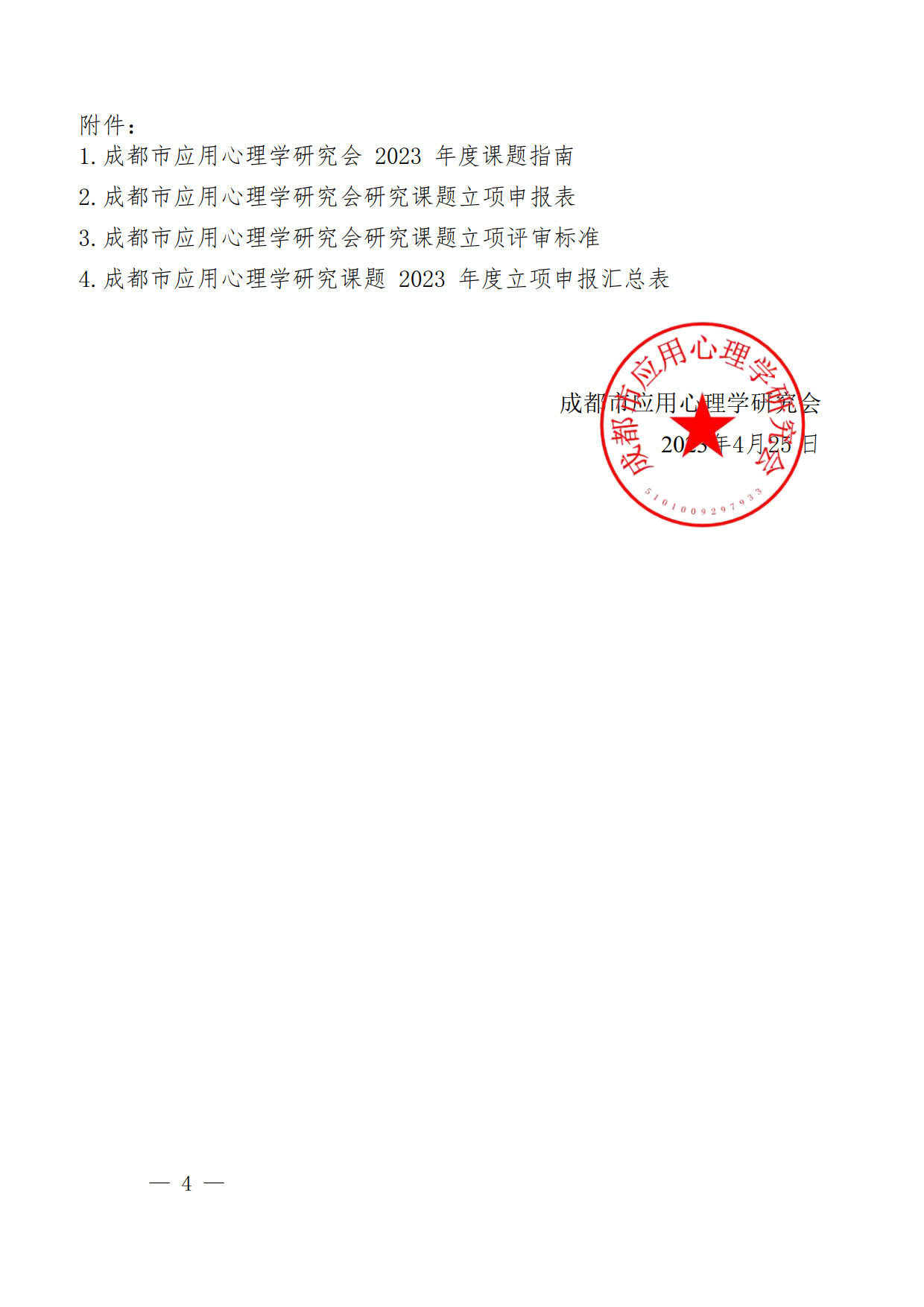 各高等院校、中小学校以及相关单位及个人: 为贯彻落实2022年5月20日国务院《十四五国民健康规划》等相关文件精神,坚持科学性与实效性相结合,推动心理健康教育高质量发展,根据《成都市应用心理学研究会科研课题管理办法(试行)》要求,经研究,决定组织开展成都市应用心理学研究 2023年度课题申报工作,现将有关事项通知如下: 一、课题申报 (一)申报范围 省内各级各类学校、各相关单位及个人均可申报。 (二)课题选题 申报单位可参照《成都市应用心理学研究会 2023 年度课题 指南》(附件 1 )提出的研究领域和方向,结合自身的研究条件和特长,自拟课题名称进行申报。本批次课题全部是一般课题,结题需要在公开刊物发表一篇5000字符以上的学术论文。各单位选题要充分考虑课题选题的可行性、价值性和创新性,预期成果要清晰。 (三)申报数量 每所高校申报不超过20个,其他单位不超过10个。 (四)申报流程及要求 1.课题单位申报 申报时间:2023 年 4月 27日—5月 20日止。逾期不再受理。申 报单位及个 人填写《成都市应用心理学研究会课题立项申报表》(附件 2)。 2.课题立项评审 2023 年 5月 21日 — 5月 30日,完成对课题的申报资格和申报内容规范性审核,形成评审意见和结论,并在 5 个工作日内正式公布立项课题名单,印发立项通知书。 (六)评审费缴纳 每个课题缴纳评审费 220 元(申报不成功原路退回)。单位可统一汇总汇款。 汇款时间:2023年 4月 27日— 5月 20日 开户银行∶中国工商银行股份有限公司成都顺兴路支行 账 号∶4402249409100061267 单位名称∶成都市应用心理学研究会 汇款时请写明立项评审费和汇款单位(个人)名称。 也可扫码付款。 二、其他 1.附件见后 2.联系人:覃老师 电话:15198200286 3.地址:成都市锦江区晨辉北路1号成都市社科联(院)专家楼 1 单元 306 室。 附件: 1.成都市应用心理学研究会 2023 年度课题指南 2.成都市应用心理学研究会研究课题立项申报表 3.成都市应用心理学研究会研究课题立项评审标准 4.成都市应用心理学研究课题 2023 年度立项申报汇总表 成都市应用心理学研究会 2023年4月25 日